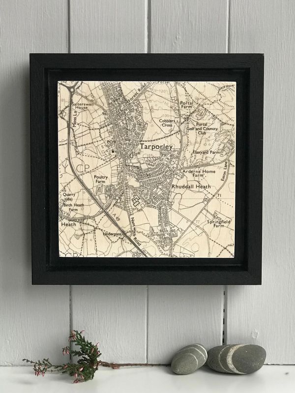 A personalised map featuring the location of your choice, printed onto natural birch plywood.